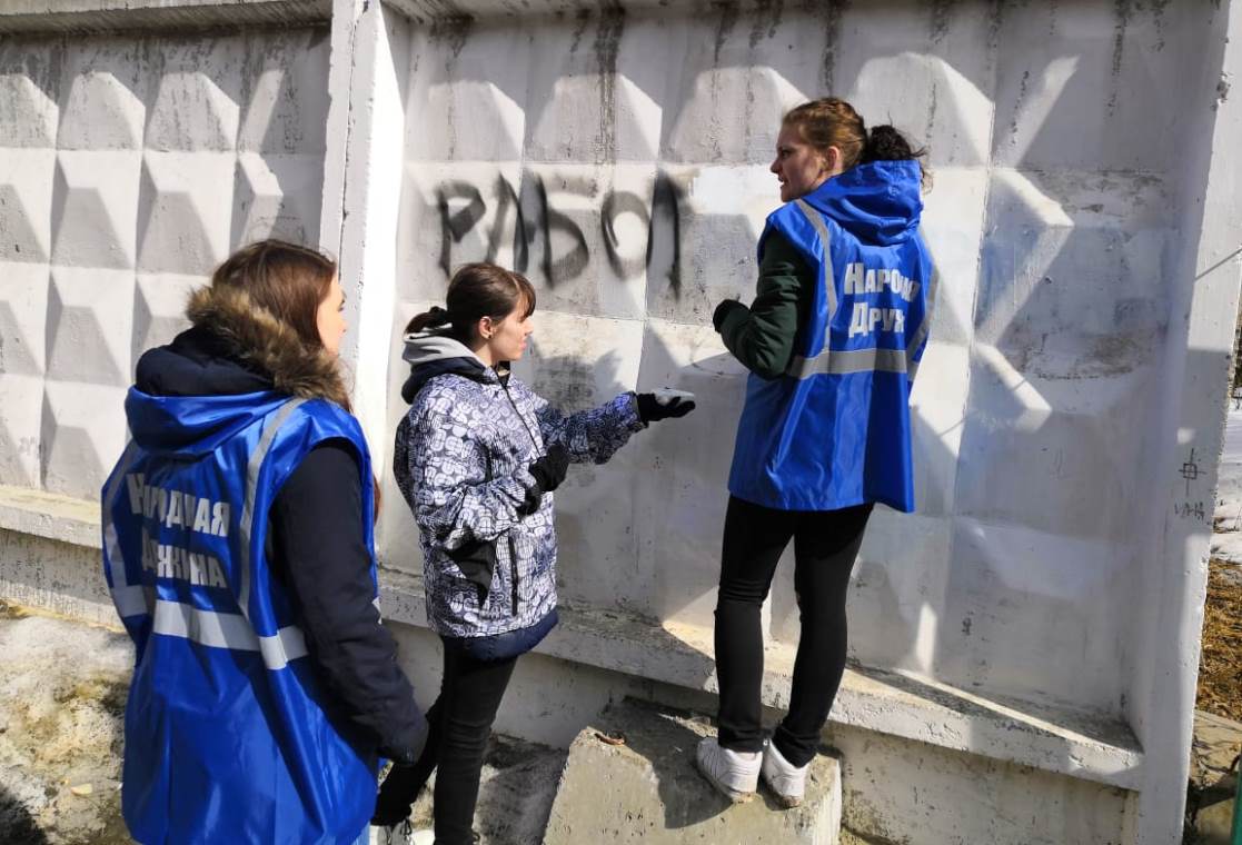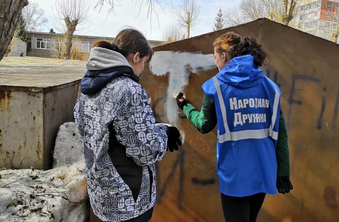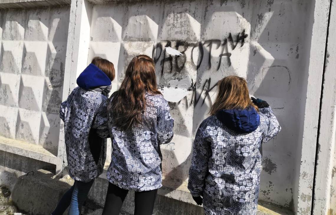 В рамках акции молодые люди закрасили надписи на заборах, гаражах, фасадах зданий - всего в десяти местах.