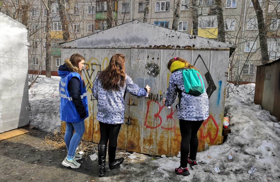 Совет молодежи и дружинники закрасили незаконные надписи на гаражах и заборах