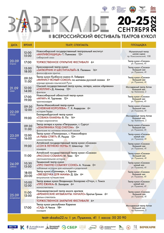 20 сентября в 17:00 в театре кукол «Сказка» состоится торжественное открытие фестиваля. Праздничная программа начнется у главного входа в театр и продолжится показом философской притчи «Затворник и Шестипалый» по произведению Виктора Пелевина (16+) (Красноярск).