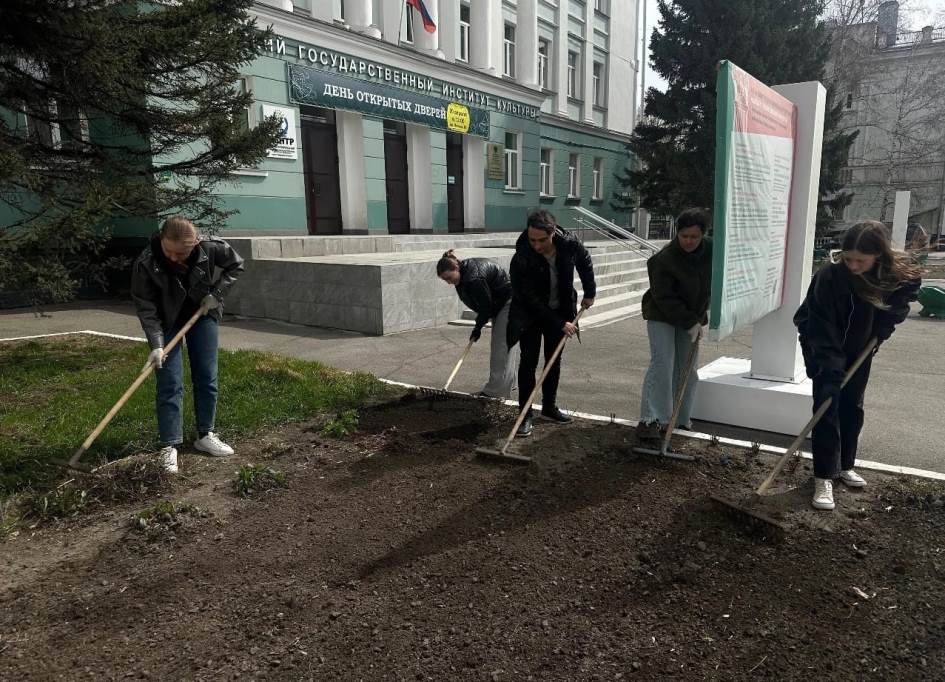 Учащиеся Алтайского государственного института культуры и искусств наводили порядок перед своим учебным заведением , расположенном по проспекту Ленина, 66.