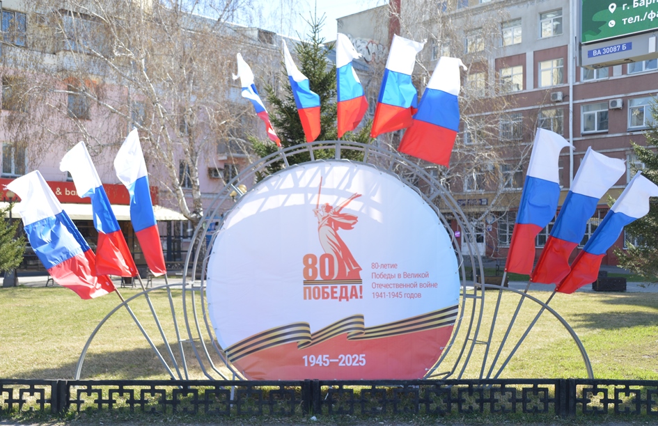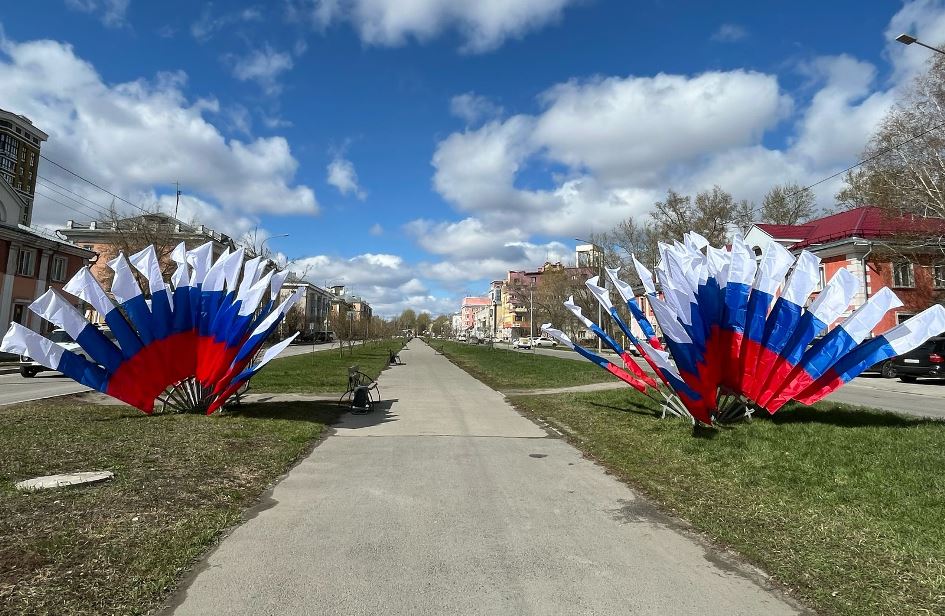 На опорах наружного освещения по улицам района разместили порядка 1600 флагов. Флаги украшают проспекты Ленина, Калинина, Комсомольский, улицы Воровского, Парфенова и Германа Титова.