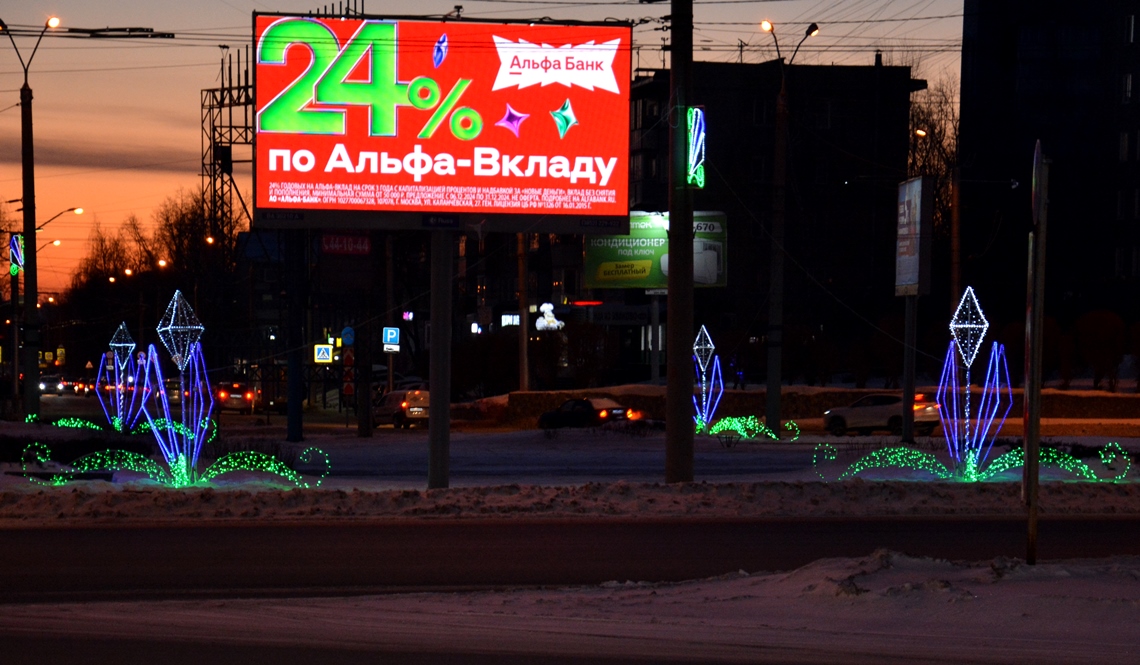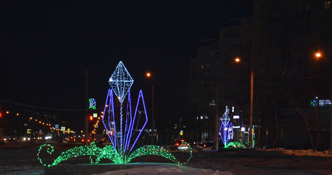 На транспортных развязках ул.Малахова-ул.Антона Петрова и ул.Юрина-ул.Малахова смонтированы световые композиции «Кристаллы».