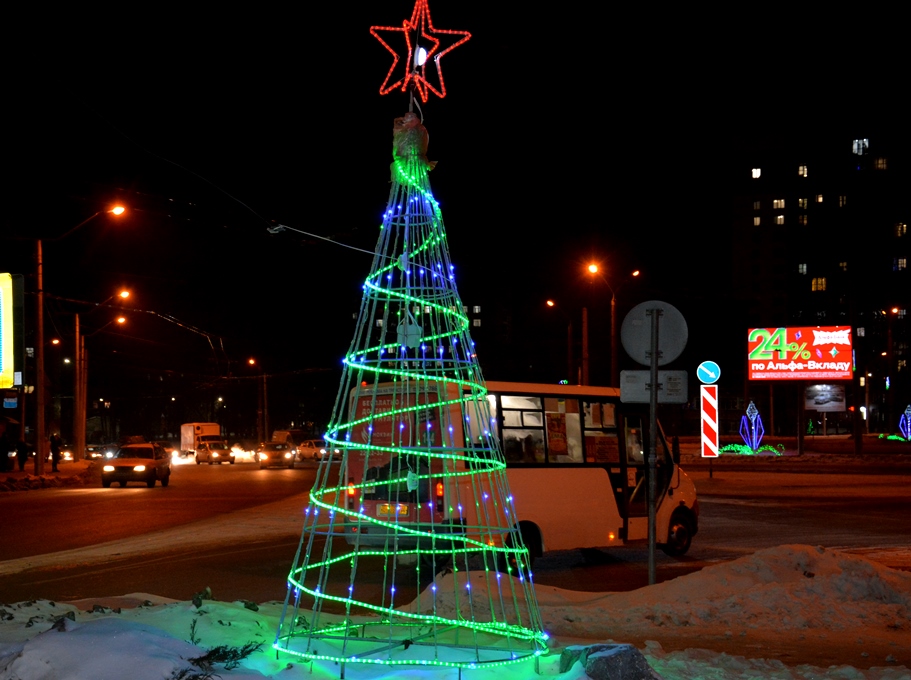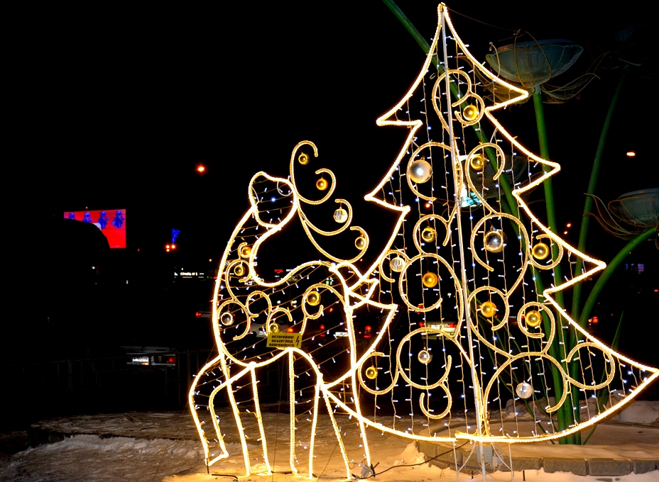 Создают атмосферу праздника и волшебства световые фигуры «Олень у Ели» на пересечении ул. Антона Петрова-ул. 2-ой Северо-Западной, ул. Малахова-ул. Советской Армии и «Ель со Звездой» на «красных линиях».