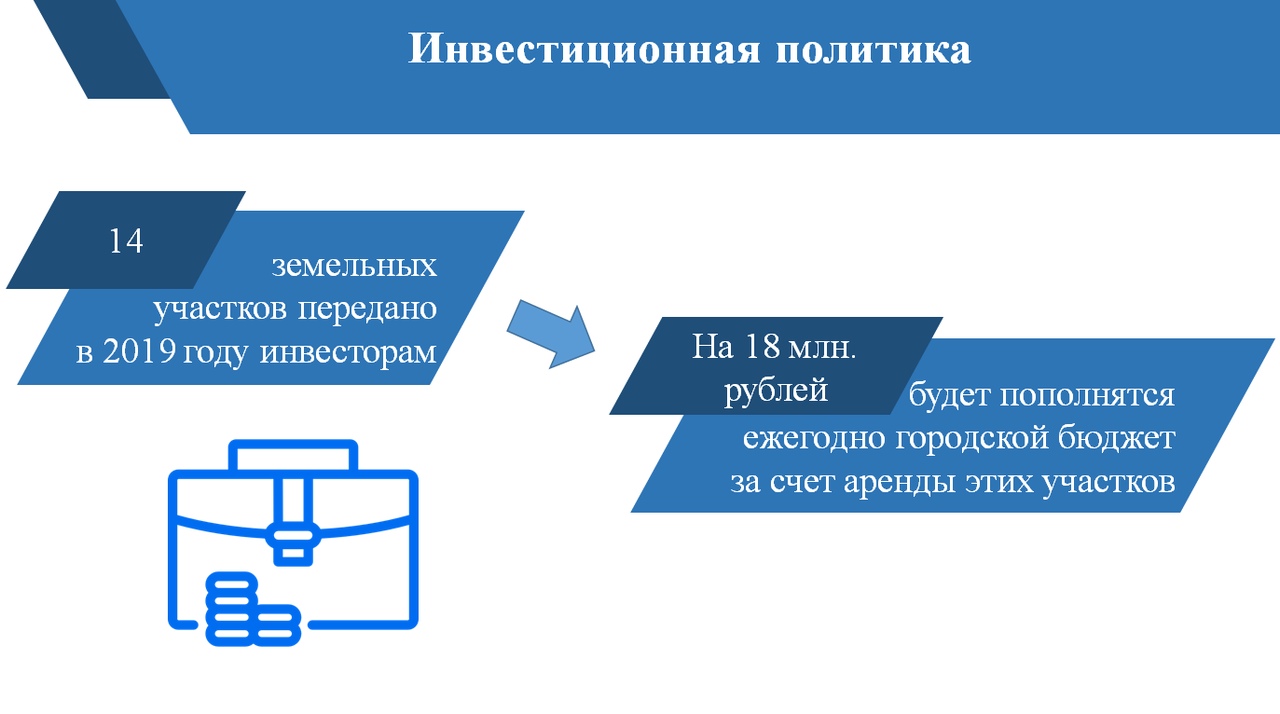 Так, в городе перешли на новый уровень взаимодействия по решению земельных вопросов инвесторов. В 2019 году инвесторам передано 14 земельных участков, ранее не востребованных на торгах. За счет их аренды городской бюджет будет ежегодно пополняться на 18 миллионов рублей. А с учётом аренды участков, переданных инвесторам в декабре 2018 года, доход от всех инвестучастков будет ежегодно приносить в бюджет около 40 миллионов рублей до завершения их застройки. В первом квартале 2020 года инвесторы готовы принять участие в аукционах на право аренды трех участков.