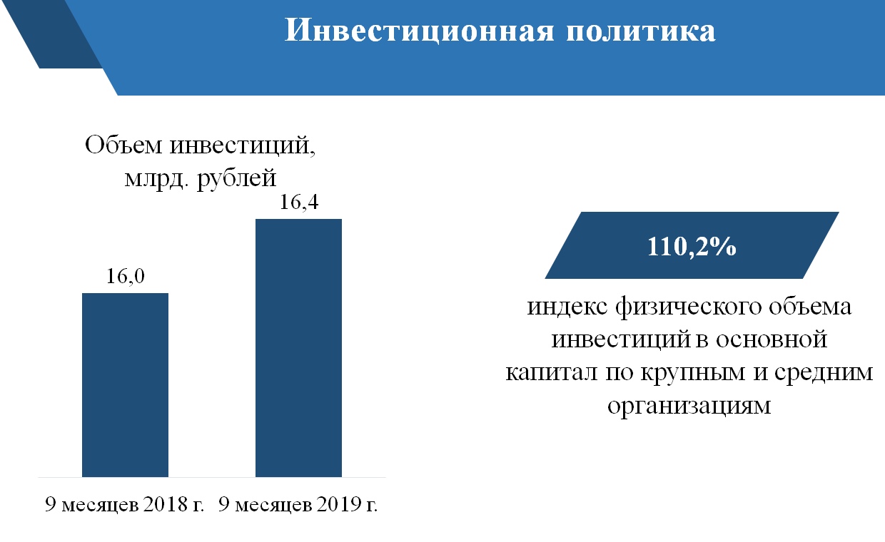 Закономерным результатом работы по повышению инвестиционной активности является рост вложений в экономику города. По итогам 2018 года объём инвестиций вырос очень существенно - в 1,5 раза, до 30,3 миллиарда рублей. За 9 месяцев 2019 года он составил 16,4 миллиардов рублей (9 месяцев 2018 г. – 16,0 миллиардов рублей). Учитывая, что основной учет инвестиций попадает в статистику по четвертому кварталу, прогнозируется превышение вложений относительно 2018 года.