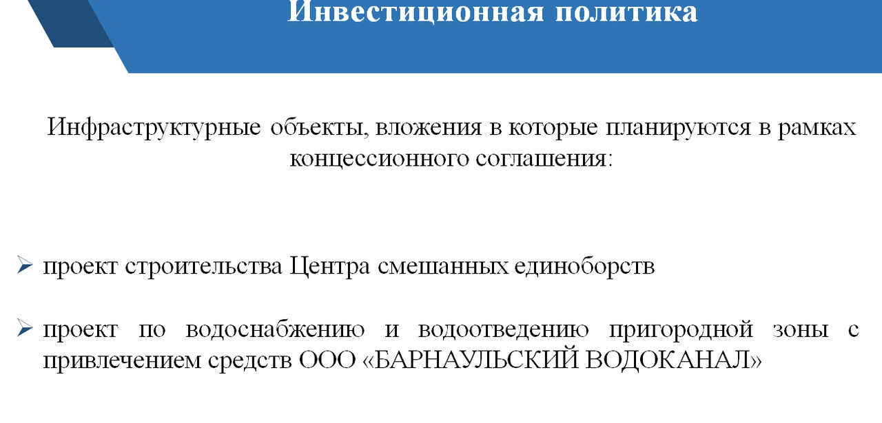 - проект по водоснабжению и водоотведения пригородной зоны, которые в рамках концессии даст возможность передать эти сети на обслуживание и развивать их не только за бюджетные деньги, но и с привлечением средств Барнаульского Водоканала, который уже вышел с заявкой на заключение соглашения. Планируется, что оно будет заключено в феврале 2020 года.