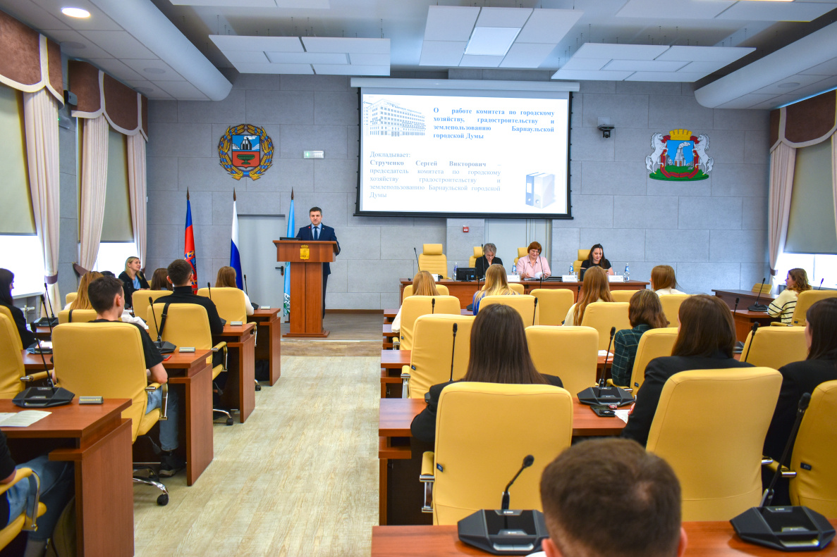 Перед студентами Алтайского государственного университета выступил Сергей Струченко, председатель комитета по городскому хозяйству, градостроительству и землепользованию Барнаульской городской Думы, который проинформировал о Барнаульской городской Думе, рассказал о деятельности комитета, связанной с обеспечением горожан теплом, водой и электричеством. Обратил внимание на работу, касающуюся строительства городских дорог и вопросов благоустройства, ответил на вопросы студентов об обращении с твердыми коммунальными отходами.