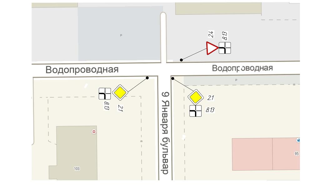 Направление главной дороги на пересечении ул.Водопроводной с бульваром 9 Января будет изменено с 11 января 2019 года в целях обеспечения безопасности дорожного движения на этом участке.