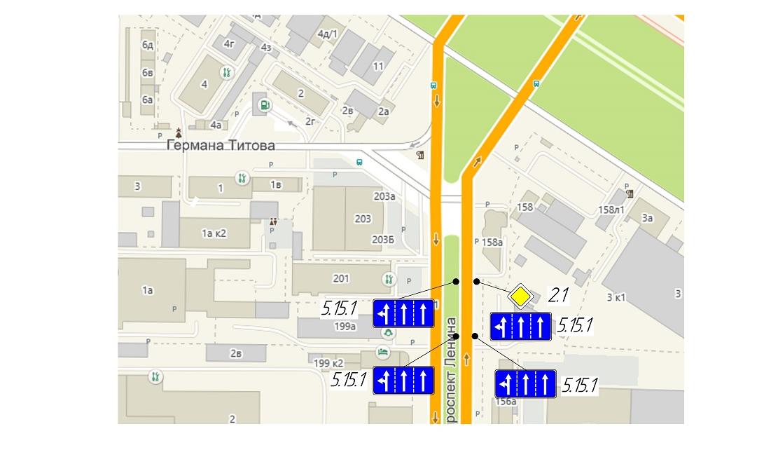 Также 11 января будут установлены дорожные знаки, информирующие автомобилистов о направлении движения по полосам по пр-кту Ленина на подходе к пересечению с ул.Германа Титова, при движении от ул.Петра Сухова.