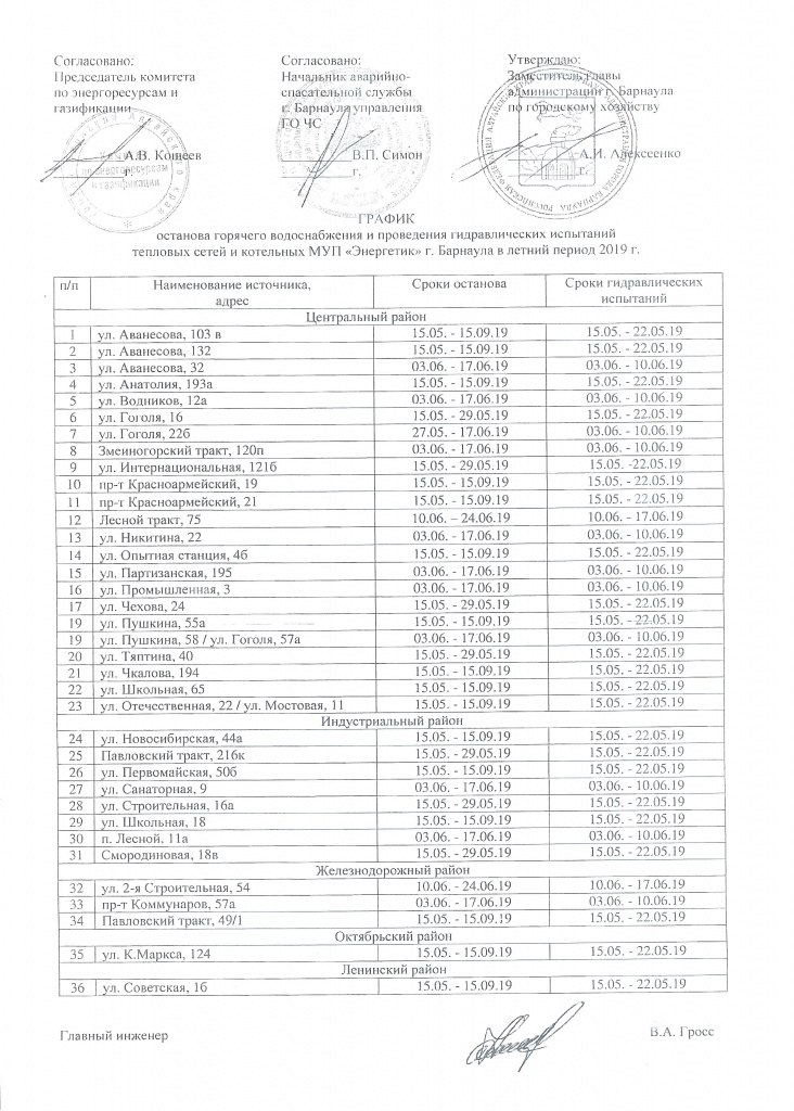 График содержит 36 адресов, куда поступает теплоресурс от предприятия. Среди потребителей, по данным комитета по энергоресурсам и газификации Барнаула, есть те, которые не пользуются услугой «горячее водоснабжение». Этим обусловлены различные сроки приостановления подачи теплоносителя в дома.