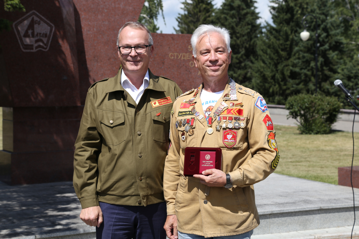 Заместитель Председателя Правительства региона Игорь Степаненко поздравил от имени Губернатора Алтайского края с открытием слета и вручил юбилейные медали, приуроченные к 85-летию Алтайского края, бойцу строительного отряда ветеранов «Старая гвардия», ветерану ССО «Монолит» Андрею Момоту и президенту клуба ветеранов СО «Медик» АГМУ, комиссару строительного отряда ветеранов и отряда Снежного десанта «Старая гвардия», ветерану ССО «Монолит» Игорю Шахматову.