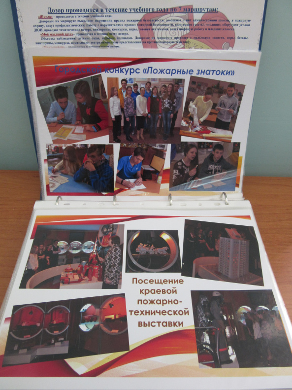 Дозор юных пожарных осуществлялся по 7 маршрутам: «Школа», «Мой младший друг», «Микрорайон», «Ёлка», «Зеленый друг», «Поиск», «Сильные, ловкие, смелые». На суд жюри команды представили отчеты о проделанной работе в виде альбома. Благодаря участию в конкурсе школьники стали более сознательно и ответственно относится к личной безопасности и безопасности окружающих.
