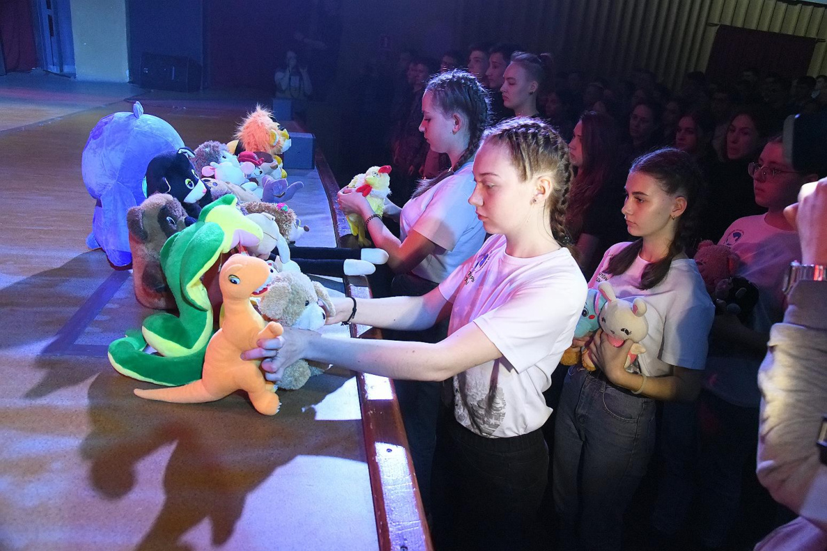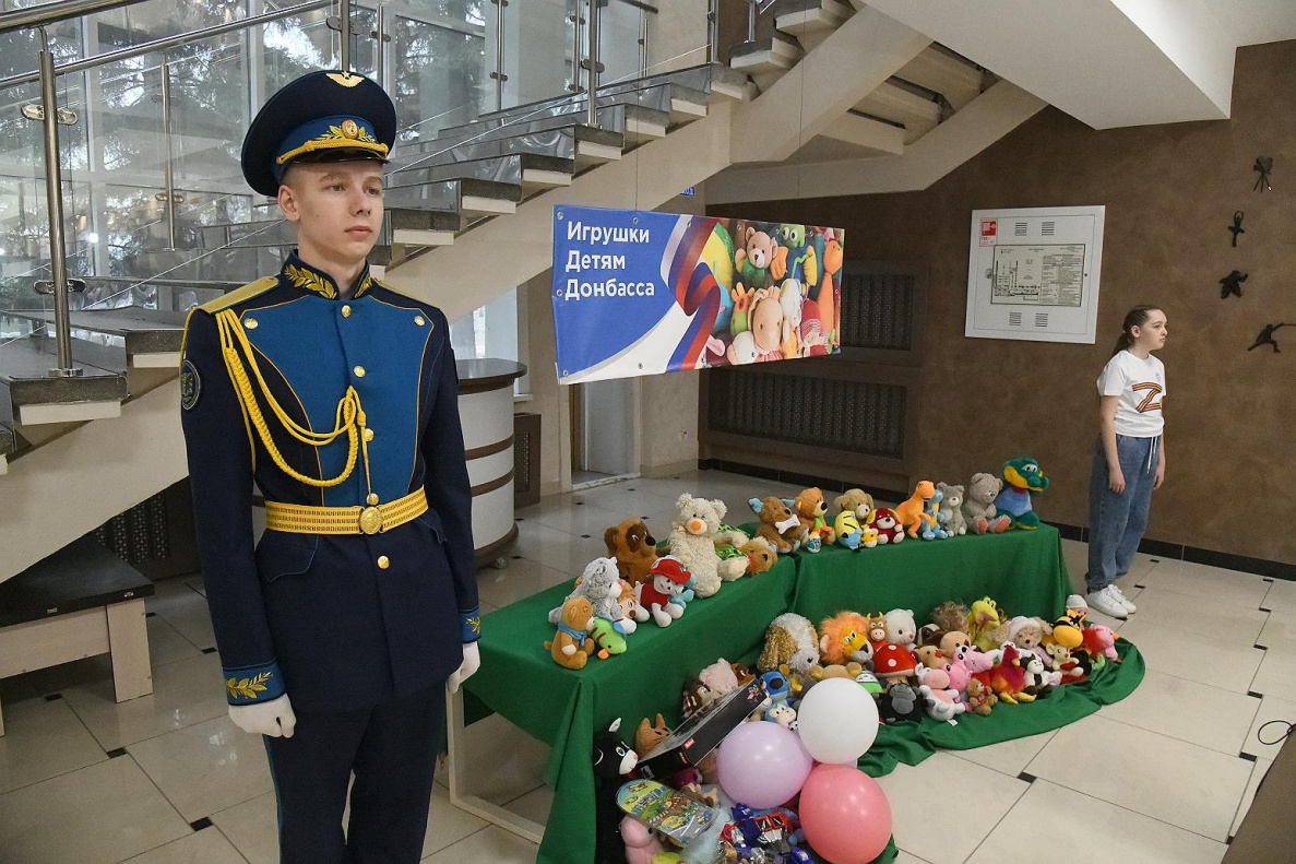 ОбществоВ рамках мероприятия начался сбор игрушек для детей, которые продолжают находиться в зоне боевых действий. В холле Дворца культуры установили небольшой подиум, на который горожане складывали мягкие игрушки. Забавные зверушки, куклы, машинки будут переданы детям Донбасса. Участник движения «Волонтер Победы» Алина Крупенова встала в почетный караул возле подиума задолго до начала мероприятия.