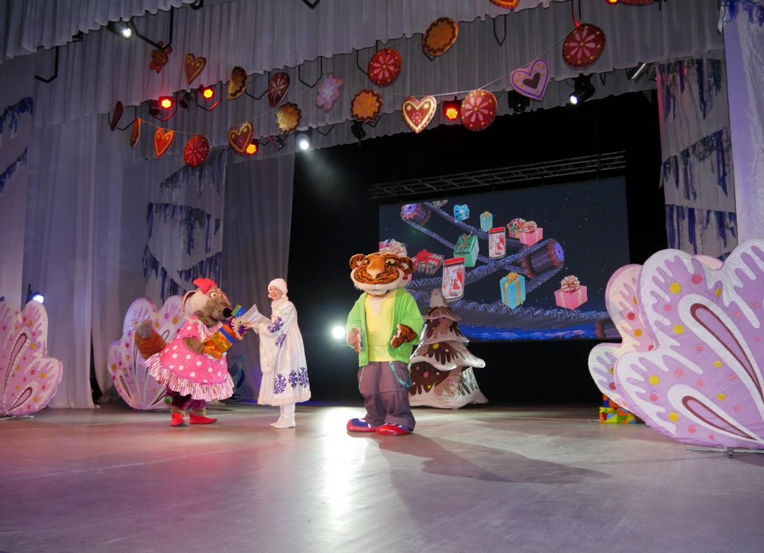 Дети приняли участие в новогодней интермедии у елки с участием сказочных персонажей, а затем посмотрели спектакль «Ледяная принцесса», подготовленный творческим коллективом Дворца культуры. Все они получили сладкие подарки.