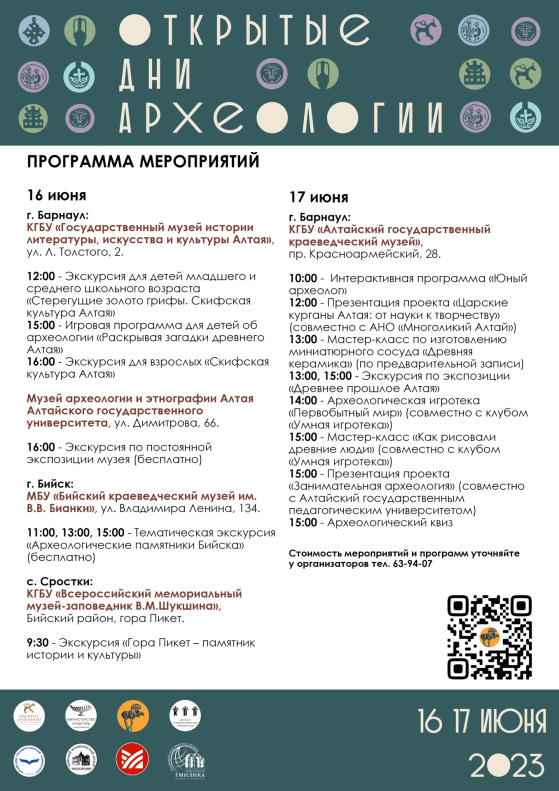 Экскурсии по археологическим экспозициям анонсировали: Государственный музей истории, литературы, искусства и культуры Алтаяи Музей археологии и этнографии Алтая (в АлтГУ). Лекторий об археологических памятниках за день трижды проведут в Бийском краеведческом, а в Сростках поднимутся на Пикет.