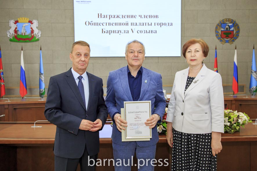 За многолетнюю добросовестную работу коллег поблагодарил председатель Общественной палаты города Барнаула V созыва Владимир Лопаткин. Он также выразил слова благодарности администрации города и Барнаульской городской Думе за участие за взаимопонимание, поддержку и постоянное сотрудничество.