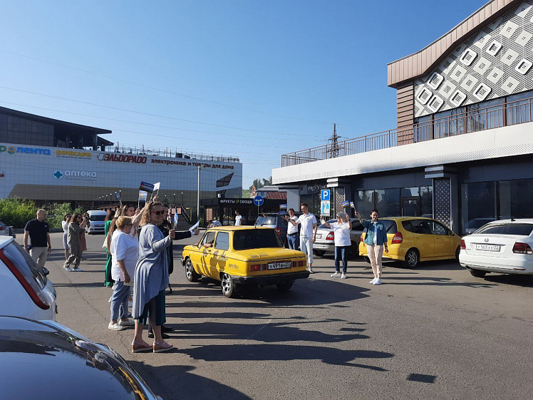 Стартовал автопробег с парковки перед Старым базаром, рядом с улицей Мало-Тобольской, где собрались все желающие проводить автолюбителей.