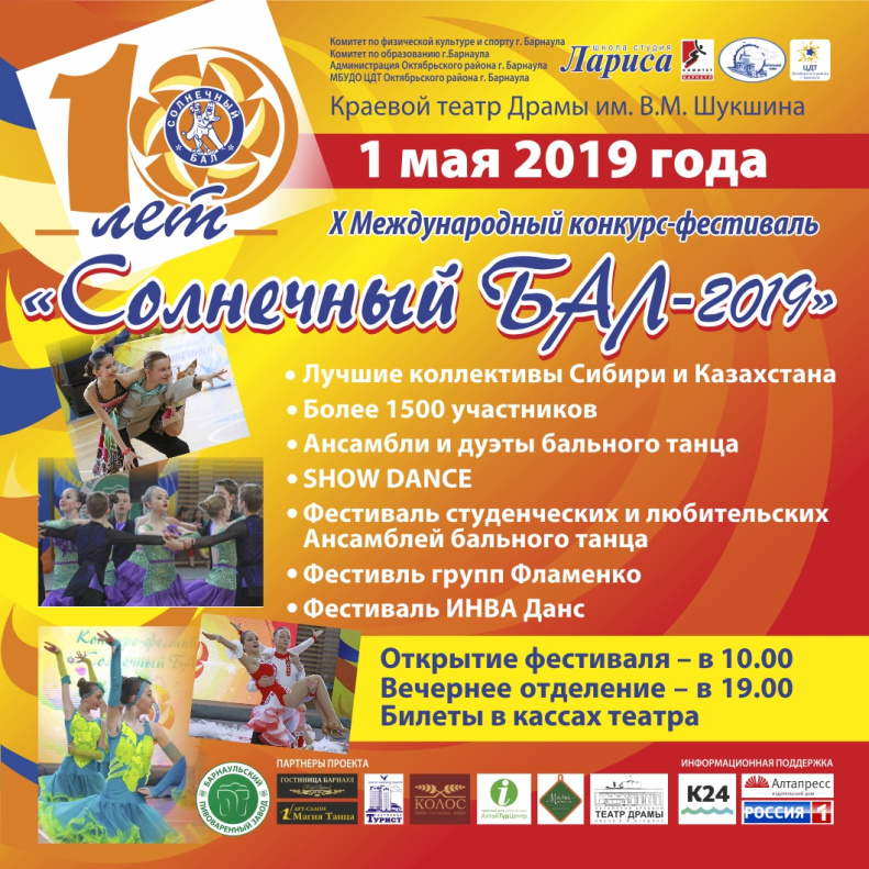 КультураСегодня, 1 мая, в Барнауле состоится X Международный конкурс - фестиваль «Солнечный бал - 2019». В юбилейном для фестиваля году он пройдет на сцене Краевого театра драмы им. В.М. Шукшина. Сильнейшие танцевальные дуэты и ансамбли будут соревноваться по 30 конкурсным номинациям и пяти возрастным категориям. Всего планируется участие более 1500 танцоров и зрителей из Алтайского края, Новосибирской, Омской, Кемеровской областей, Красноярского края, республик Казахстан и Алтай.