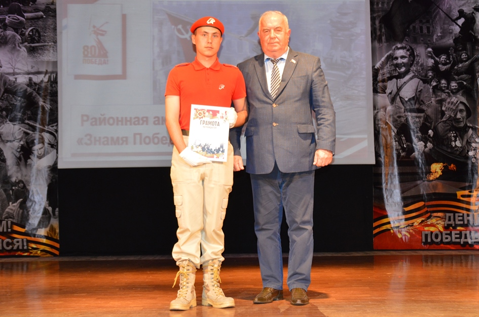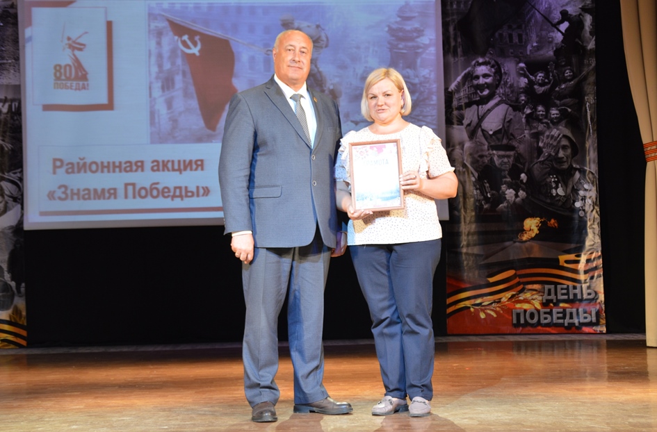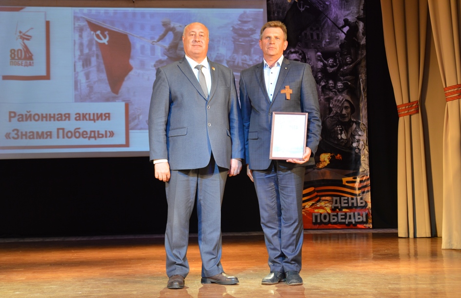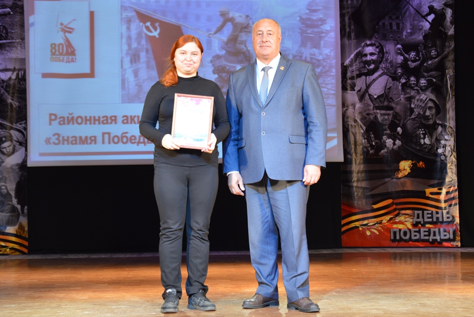 Накануне, 13 мая, в Доме культуры «Октябрьский» состоялась торжественная церемония закрытия районной акции «Знамя Победы», посвященной 80-й годовщине Победы в Великой Отечественной войне 1941-1945 годов, а также Году защитника Отечества.
