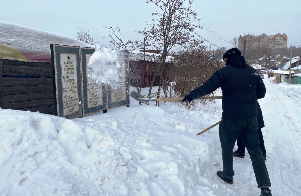 Студенты Алтайской академии гостеприимства провели акцию по очистке от снега территории, прилегающей к памятнику Героям Советского Союза Н.Д.Маркелову, И.В.Халманову, А.И.Балабанову, расположенному в микрорайоне «Докучаевский».
