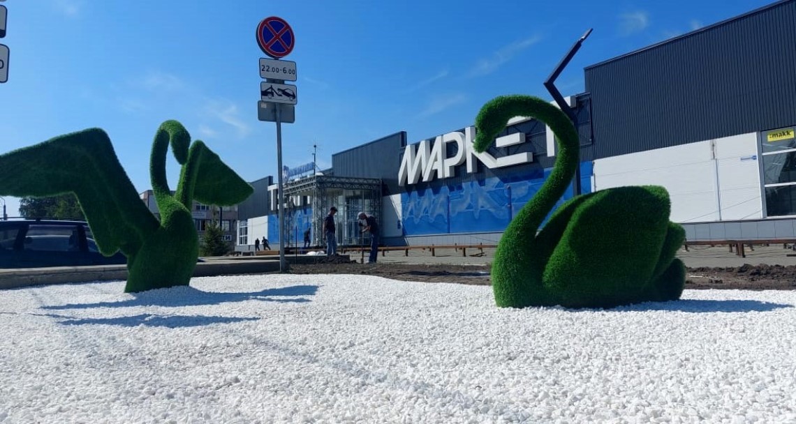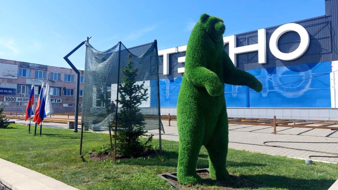 Торговый комплекс «Техно-Маркет» оформил свою территорию декоративными фигурами - топиари. Это скульптуры с металлическим каркасом и всесезонным покрытием из синтетической травы.