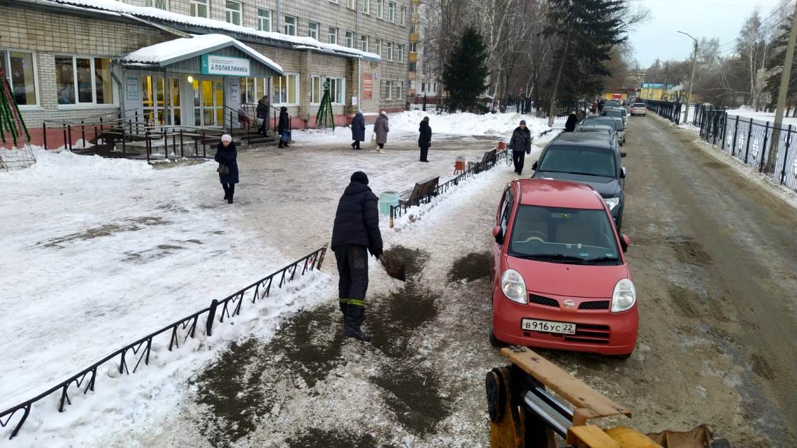 Подрядной организацией проведены работы по посыпке тротуара вдоль поликлинического подразделения №1 Краевой клинической больницы скорой медицинской помощи №2.