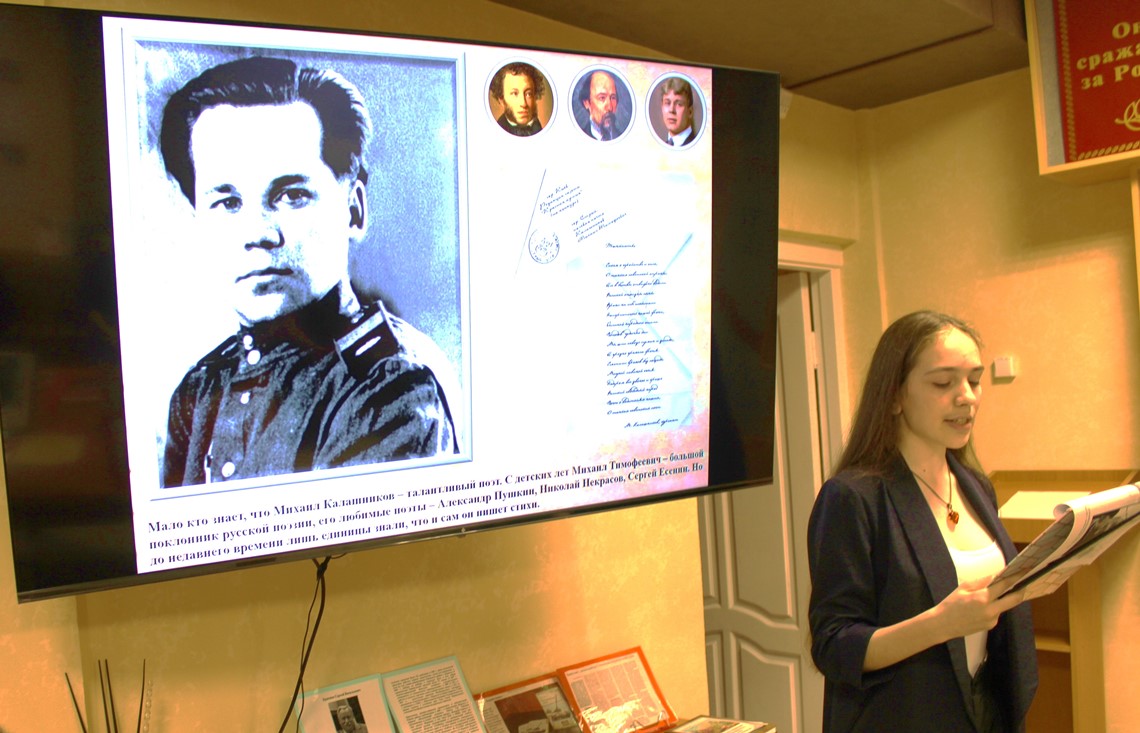 Большой интерес вызвало выступление ее коллеги – экскурсовода, ученицы девятого класса Арины Сартаковой, которое было посвящено нашему земляку – Герою России, дважды Герою Социалистического Труда, выдающемуся конструктору-оружейнику Михаилу Калашникову.