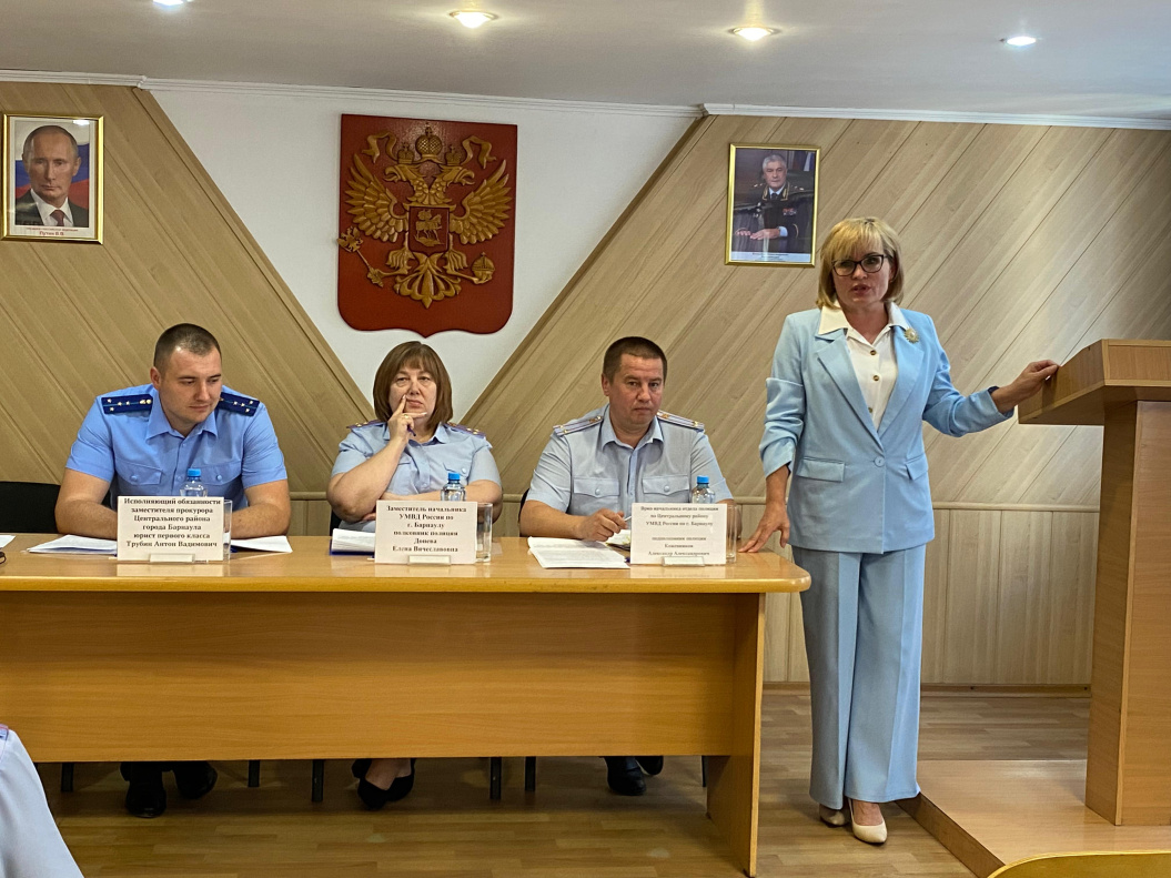 В работе совещания приняли участие: заместитель начальника УМВД России по городу Барнаулу полковник полиции Елена Донева, исполняющий обязанности заместителя прокурора Центрального района города Барнаула юрист первого класса Антон Трубин, заместитель главы администрации Центрального района города Барнаула Мария Тибекина, руководители структурных подразделений отдела полиции.