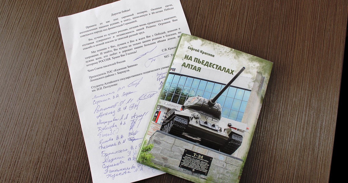 Вместе с окопными свечами в зону проведения специальной военной операции отправятся рукавицы, подушки, продукты питания и книги Сергея Краснова «На пьедесталах Алтая», в которых все желающие написали обращения к бойцам, с благодарностью за их тяжелый ратный труд.