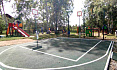 Подрядной организацией подготовлено основание размером 7,5м*7,5м с осуществлением выемки грунта, выполнены работы по трамбовке подготовленной территории. Засыпана гравийная подушка щебнем, выполнено ее уплотнение и выравнивание. Установлен поребрик, площадка залита бетоном, нанесено ударопоглощающее покрытие, размещена защитная сетка.