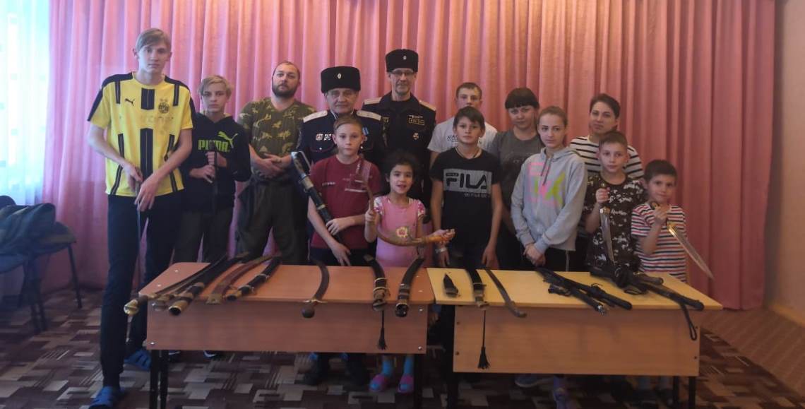 Воспитанникам Центра рассказали о подвигах казаков во время Великой Отечественной войны, продемонстрировали выставку традиционного казачьего оружия, показали элементы владения шашкой, кинжалом, боевого казачьего пляса.