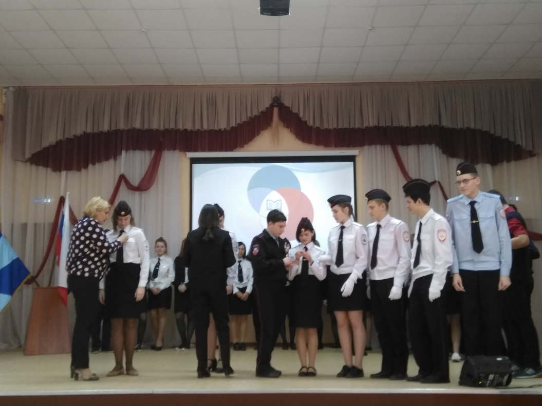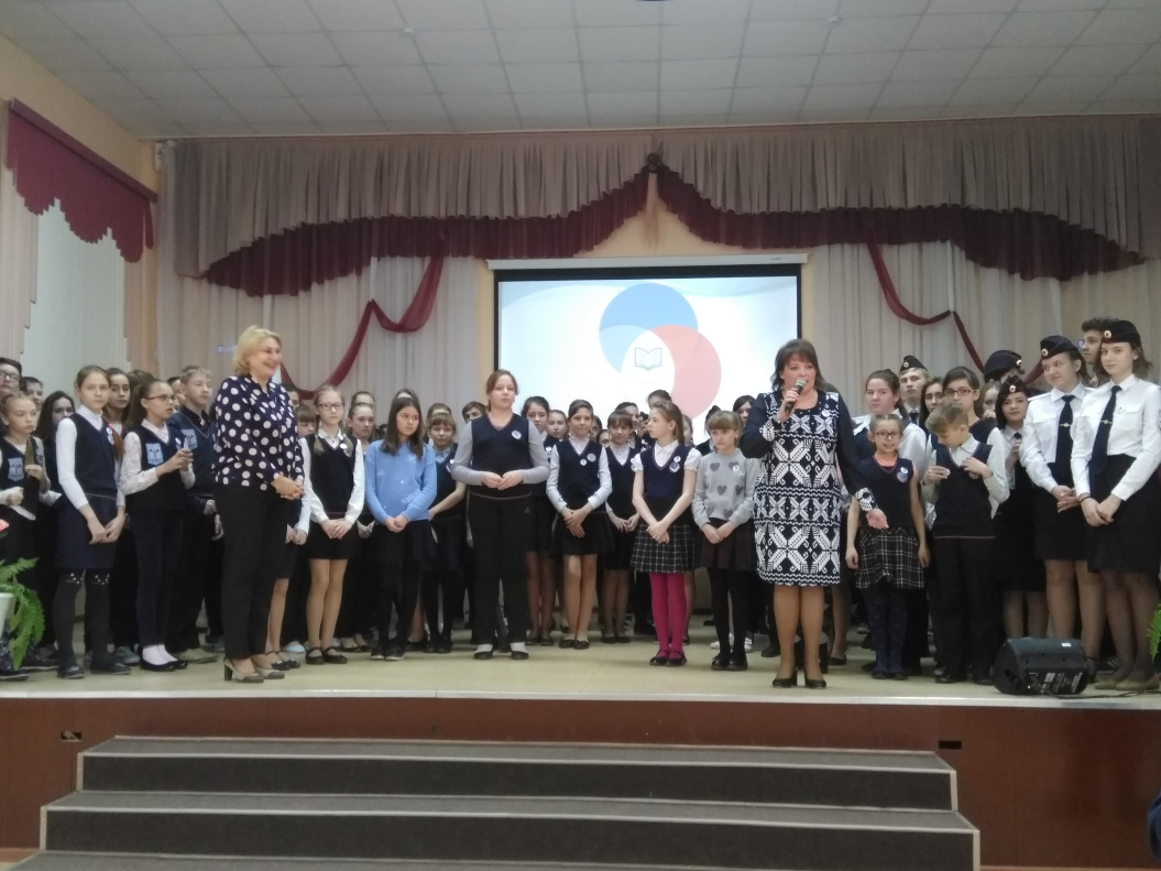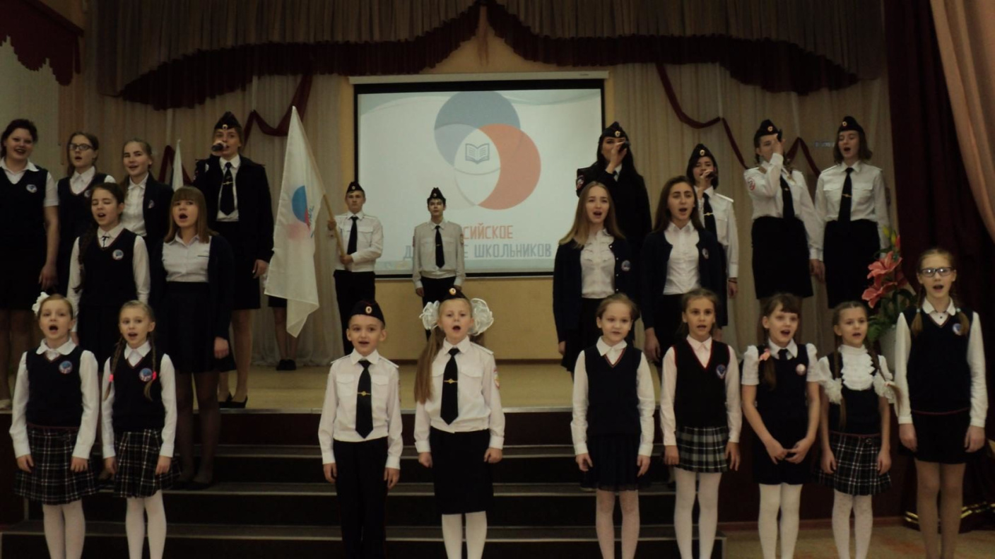 Знамённая группа внесла флаг Российского движения школьников, после чего школьный хор исполнил гимн. Всем собравшимся в зале рассказали о результатах добровольческой деятельности отряда милосердия «Рядом», детских педагогических отрядов юных вожатых школы, а также определили направления добровольческой работы на год.