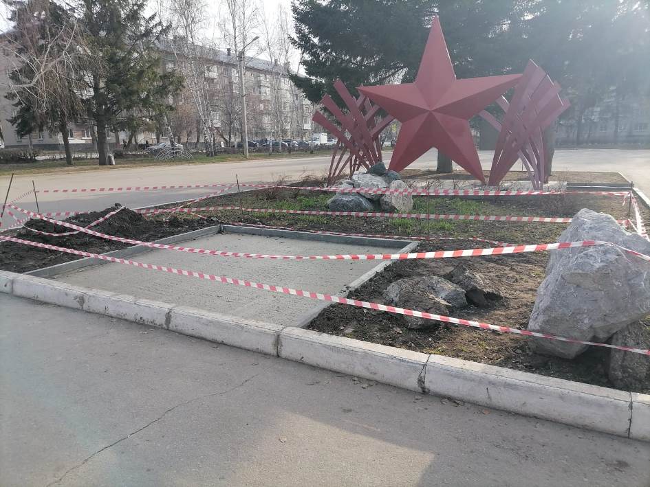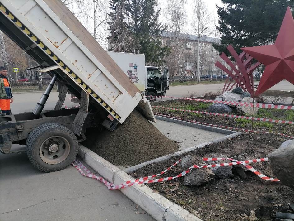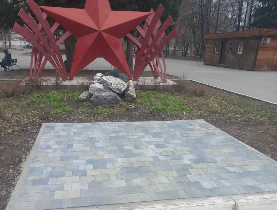 На прошедшей неделе работники подрядной организации демонтировали камень и мраморную доску для реставрации, а на текущей неделе – изготовили бетонное основание размером 3х3 метра, на которое уложили тротуарную плитку.