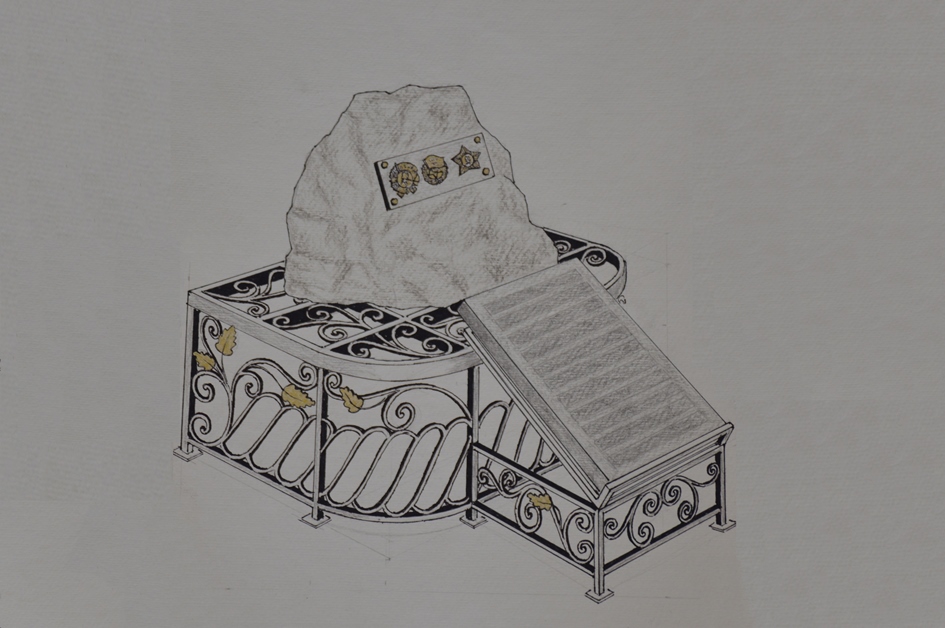 Затем на основание поставят кованую конструкцию, на которой закрепят камень и мраморную доску. На камне установят табличку с орденами и гравировкой.