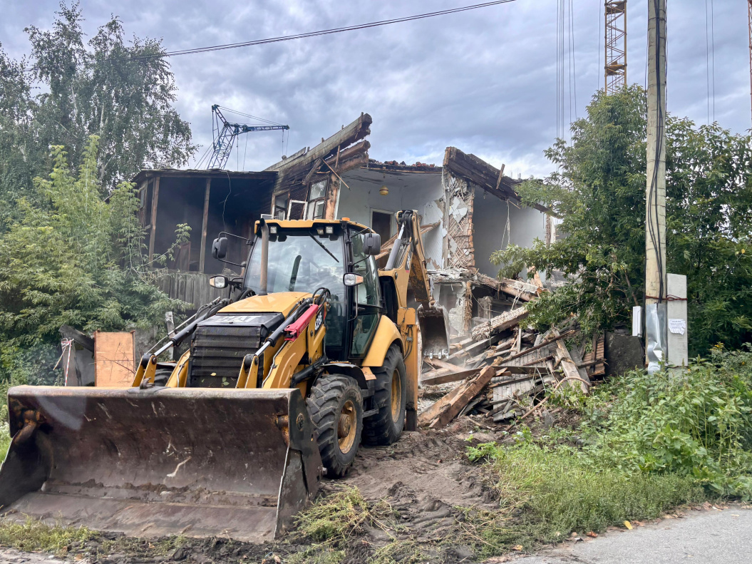 Ранее рабочие демонтировали кровлю и строительные конструкции дома. В настоящее время ведутся работы по планировке территории.