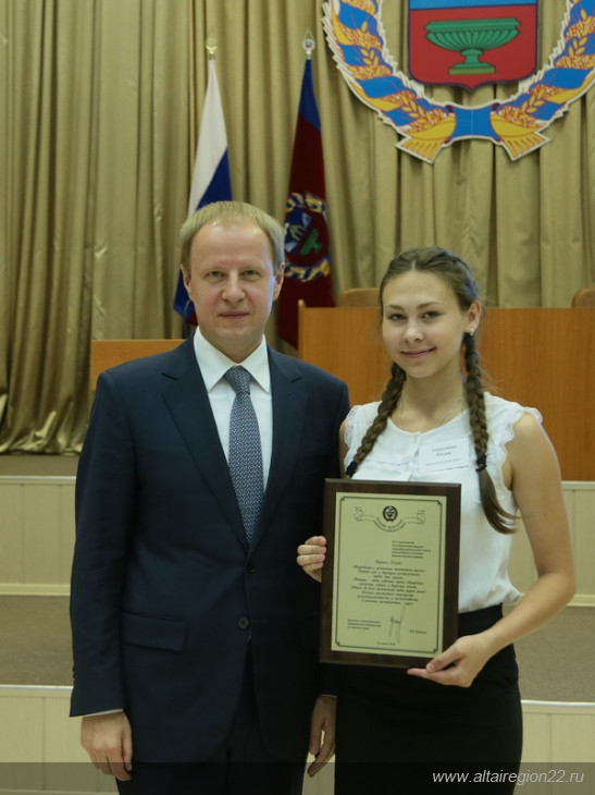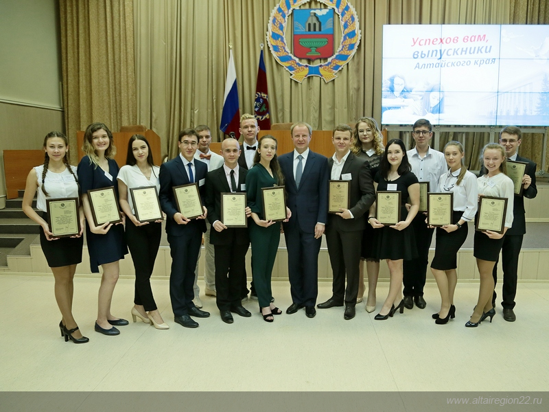 Среди ребят, получивших памятные адреса на торжественном приеме у Губернатора, были победители олимпиад и конкурсов регионального и российского уровня. Это, например, выпускник Бийского лицея-интерната Алтайского края Александр Дорогов; выпускница гимназии №69 Ольга Атабаева; выпускница средней школы №102 Ляна Волокитина и выпускница гимназии №22 города Барнаула Дарина Сибуль; выпускник лицея №6 Алексей Толстобров и выпускник гимназии №3 города Рубцовска Алексей Поваляев - призеры заключительного этапа Всероссийской олимпиады школьников; выпускник Михайловской школы №1 Михайловского района Донат Кузнецов - победитель и призер регионального этапа Всероссийской олимпиады школьников по пяти предметам; победитель Всероссийского конкурса сочинений «Россия, устремленная в будущее» Дмитрий Приб из Заринска.