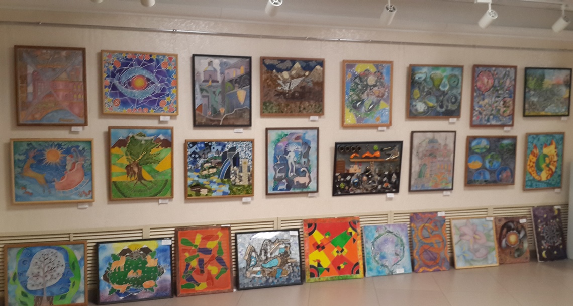 Работы выполнены в различных техниках: батик, гобелен, лоскутное шитье, художественная кукла, валяние из шерсти, декупаж, коллаж.