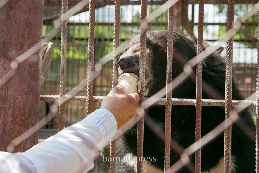 У вольера с гималайскими медведями состоялось настоящее шоу, привлекшее внимание многих посетителей – директор зоопарка угостил мороженым медведей Жору и Дашу.